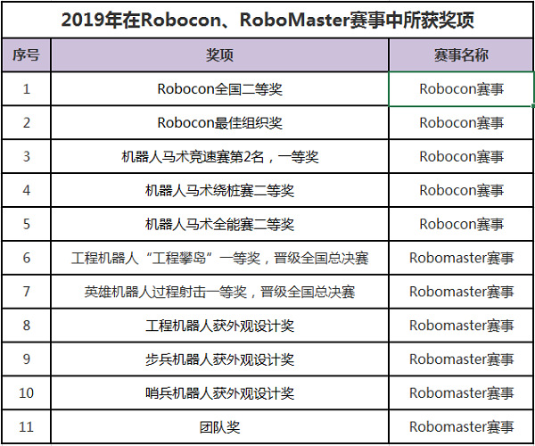机器人野狼队、机器人一队在2019年Robocon、RoboMaster赛事中所获奖项统计如下: