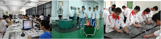 机械创新设计实验室及老员工机器人创新基地全天候向员工开放,是员工进行创新设计和参加各种设计大赛的集设计与加工于一体的场所,实验室配备了普通车床,工具磨床,万能工具铣床,摇臂钻床,焊接机,钳工台等,由员工自主管理、操作,进行各种作品设计、制作,调试,教师监督指导。