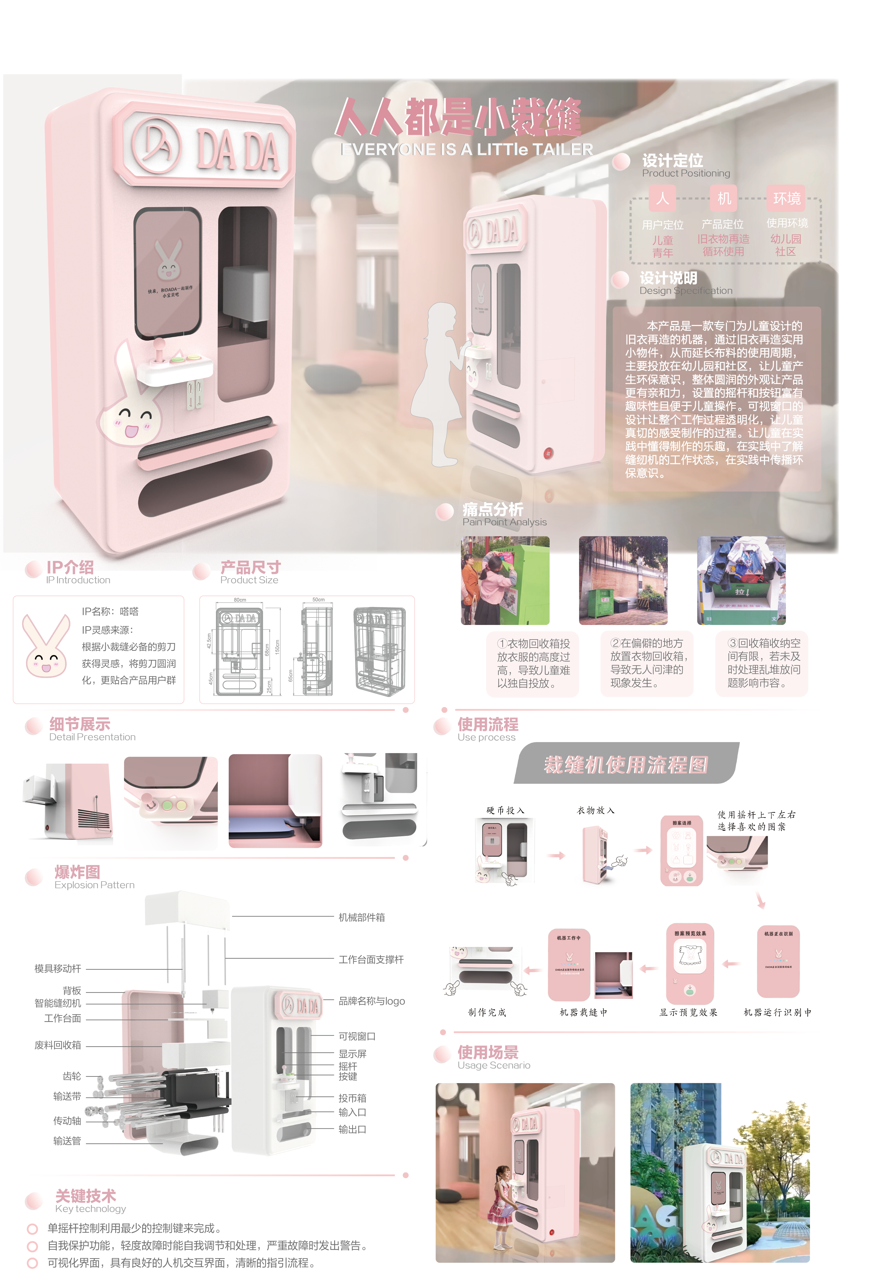 这是一款专门为儿童设计的日衣再造的机器,通过旧衣再造实用小物件,从而延长布料的使用周期主要投放在幼儿园和社区,让儿童产生环保意识,整体圆润的外观让产品更有亲和力,"设置的摇杆和按钮富有趣味性且便于儿童操作。可视窗口的设计让整个工作过程透明化,让儿童真切的感受制作的过程。让儿童在实践中懂得制作的乐趣,在实践中了解缝纫机的工作状态,在实践中传播环保意识。