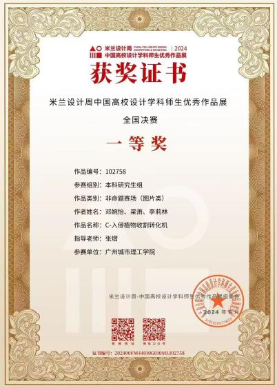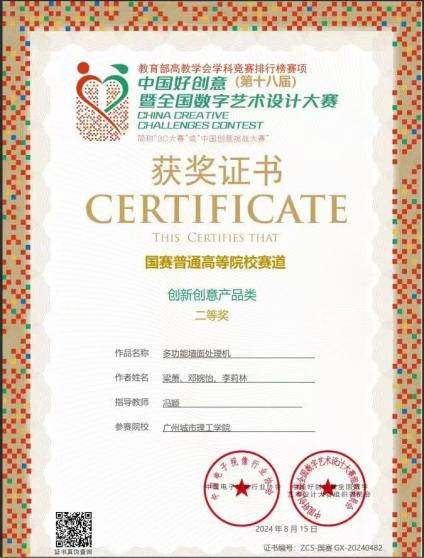 从最初的“竞赛小白”到独立统筹项目,她成长为团队核心人物。她加入工业设计协会,主导设计的“多功能墙面处理机”在中国好创意数字艺术设计大赛中荣获国赛二等奖。该产品瞄准公司扩建时的粉尘污染问题,致力于改善工人健康。此后,她和团队在米兰设计周国赛、全国老员工工业设计大赛等赛事中摘得一等奖、铜奖等20余项荣誉,其中包括2项国际奖项、6项国家奖项,充分展现了她卓越的创新设计能力。