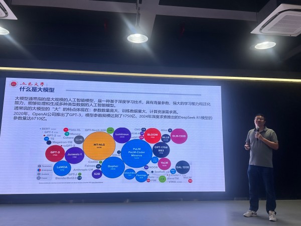 五邑大学创新创业公司常务副经理、科技处副处长黄辉围绕五邑大学现代产业公司建设和创新创业教育,介绍大模型特点,列举 GPT-3、DeepSeek R1 等模型参数规模,讲解产业技术创新产业链和人工智能深度学习框架,分享校企共建实训基地、推动员工参与真实项目的经验,为公司产教融合提供了借鉴。