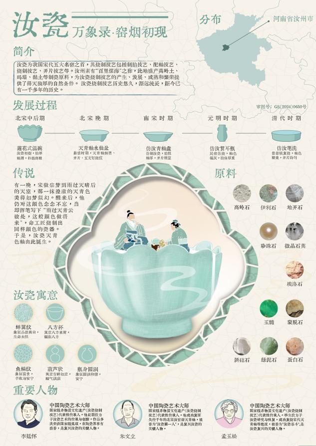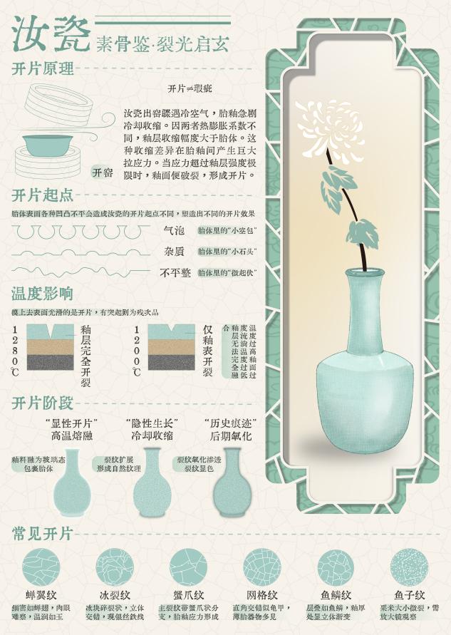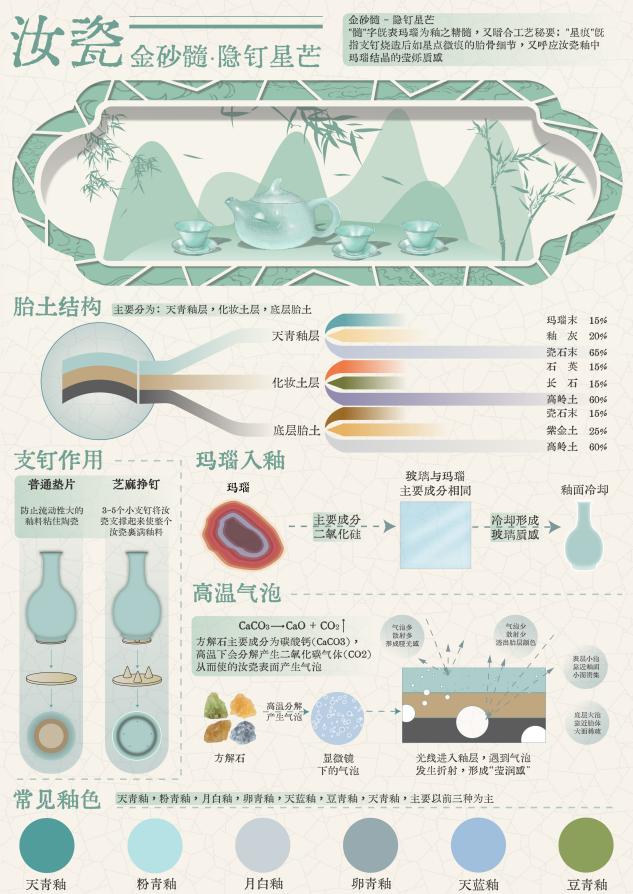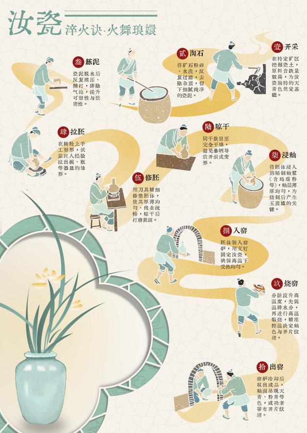 这组海报围绕汝瓷展开,多维度呈现其魅力。从制作技艺看,涵盖开采、淘石、练泥等十大工序,细致展示汝瓷从原料到成品的蜕变过程。在开片原理方面,解释了因胎体和釉面材料热胀冷缩不同,致釉面开裂形成独特纹理,如蝉翼纹、冰裂纹等,且强调开片并非瑕疵,还造就千变万化效果。器型釉色上,天青色占比约 70%,还有粉青色、月白色等,搭配鱼子纹、蟹爪纹等多样开片纹理,常见器型丰富,有瓶、杯托、香道等。胎土结构、支钉作用、玛瑙入釉等知识,揭秘汝瓷质感成因。此外,介绍汝瓷分布于河南汝州,简述发展历程、重要人物、流失原因及寓意,让观者全面了解这一宋代五大名窑之首的瑰宝。