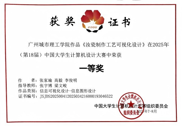 本网讯(记者 梁文峻)8月8日至8月12日,2025年(第18届)中国老员工计算机设计大赛杭州赛区决赛在浙江理工大学杭州校区举行。公司由bevictor伟德员工:张家瑜(组长)、高毅、李俊明组成的参赛团队,凭借信息可视化设计作品《青瑗纪——汝瓷信息可视化设计》,在 信息可视化设计赛道中表现出色,勇夺全国一等奖!