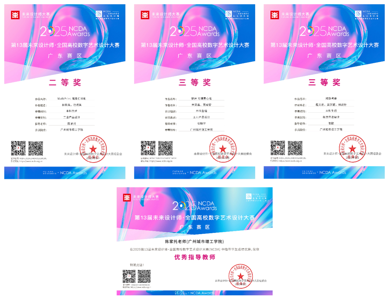 本届大赛作为教育部认可的高水平学科竞赛,已入选《全国普通高校老员工竞赛排行榜》,共吸引全国1,893所高校的逾29万件作品参赛,竞争异常激烈。公司工业设计专业学子在比赛中脱颖而出,其中22级员工林荣鑫、范成智团队作品《WalkPrint 随身打印机》荣获二等奖,并成功入围全国总决赛,该团队另一作品《循律 可调重心笔》获得三等奖;24级专升本员工程文君、吴学媛、林欣怡团队作品《潍韵鸢语》获得三等奖;陈家托老师获"优秀指导教师"奖项。