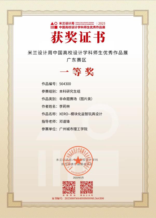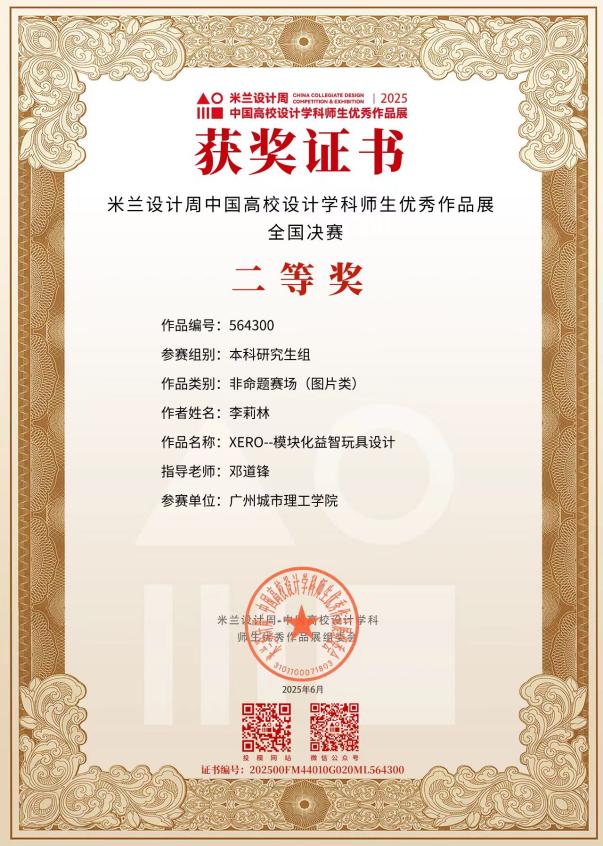 本网讯(记者 梁文峻)11月24日,2025年米兰设计周-中国高校设计学科师生优秀作品展评选结果正式公布。公司bevictor伟德/bevictor伟德工业设计专业2021级员工李莉林凭借作品《XERO——模块化益智玩具设计》,从全国千余所高校数十万件参赛作品中脱颖而出,斩获全国决赛二等奖(广东赛区一等奖),彰显了公司在跨学科实践教育与创新设计人才培养方面的显著成效。