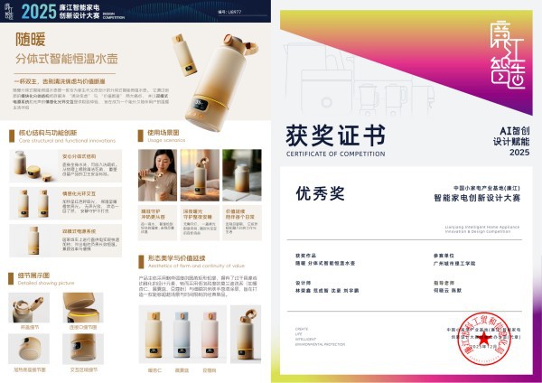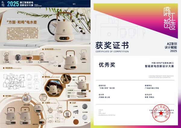 本次获奖作品主要来源于《产品开发设计》课程的教学实践,课程通过深度整合校企资源,将产业需求与教学实践紧密结合。林荣鑫、范成智、沈豪和刘宇鹏团队设计的“随暖——分体式智能恒温水壶”荣获“最佳创意奖”与“优秀奖”,武心语与卢昊暖设计的“方圆·和鸣电水壶”荣获“优秀奖”。指导教师何晓云获评“优秀指导老师奖”。课程负责人何晓云表示:“在《产品开发设计》课程中,我们特别注重将企业实际需求与设计教育相结合,通过与广州市原子设计有限公司产业协作创新中心等本地优秀企业建立长期合作关系,构建了‘校企双导师’协同培养机制。”