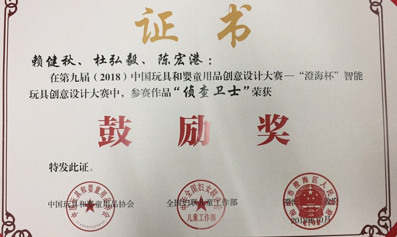 赖健秋 杜弘毅 陈宏港获第九届(2018)中国玩具和婴童用品创意设计大赛--“澄海杯”智能玩具创意设计大赛鼓励奖