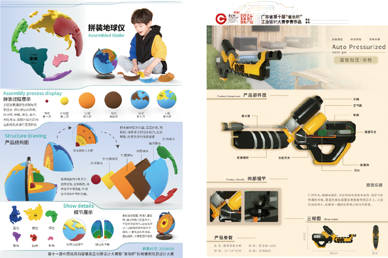 其中获得科教娱乐玩具创意设计大赛的优秀奖为马卓恒、黄珍珍、关芷悠小组的“拼装地球仪”和杨洋、刘锐昕、郭主力小组的“雷普水枪”。“拼装地球仪”产品是一个益智拼装类的地球仪,通过儿童对地球仪的拼装,锻炼小孩的动手能力和对色彩的认识,在拼装过程中,同时可以学到地球的内部构造以及各个大陆的分布地理知识。“雷普水枪”产品是通过以往多种不同水枪的灵感,设计一个一键替代手动抽拉水泵的翻式,通过电动的方式是活塞自动轴拉,使得气缸增压,扣动扳机射出水流。