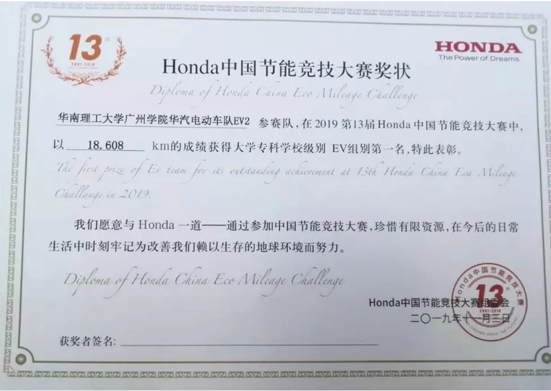 2019第十三届Honda中国节能竞技大赛获奖
