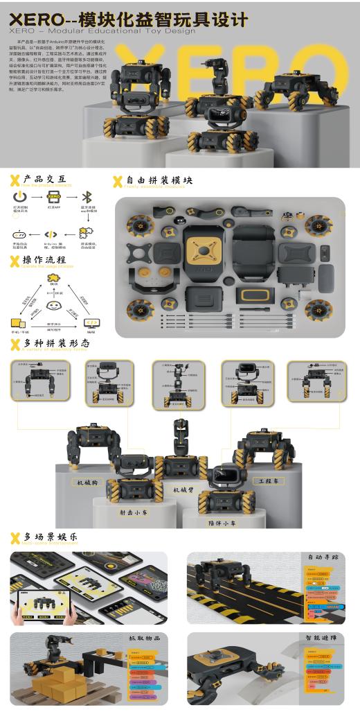获奖作品《XERO》以Arduino开源硬件平台为基础,围绕“自由创造、跨界学习”的核心理念,深度融合编程教育、工程实践与艺术表达。通过集成开关、摄像头、红外感应器、蓝牙传输器等多功能模块,结合标准化接口与可扩展架构,用户可自由搭建个性化智能装置。该设计不仅构建了一个支持跨学科应用、互动学习与游戏化竞赛的全方位学习平台,更通过高自由度DIY定制,有效激发青少年的编程兴趣与逻辑思维能力,兼具教育价值与娱乐价值。